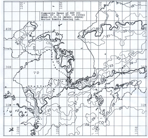 o 금주 (2004.07.13∼07.19)의 한국근해 표면수온은 대화퇴 근해 21∼22도, 울릉도 근해 21∼22도, 대마도 근해 24∼26도, 제주도 근해 25∼26도, 이어도 근해 25∼27도, 일향초 근해 24∼25도, 어청도 근해 20∼21도 내외로 나타납니다. o 「평년에 비해」수온은 대화퇴 근해 0.5도 낮게, 울릉도 근해 비슷하게, 대마도 근해 1도 높게, 제주도 근해 1.5도 높게, 이어도 근해 비슷하게, 일향초 근해 0.5도 높게, 어청도 근해 2.5도 낮게 나타납니다. o 수온 전선대는 제주해협-대한해협서수도간 해역에서 수온 24도를 중심으로 형성될 것으로 나타납니다. < 위의 그림을 클릭하시면 확대된 수온정보를 보실 수 있습니다 >
