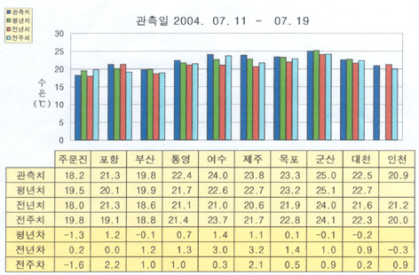 o 금주(2004.07.11∼07.19)의 한반도 연안 표면수온은 동해 연안역에서 섭씨 18∼21.5도, 남해 연안역에서 20∼24도, 서해 연안역에서 21∼25도 내외로 나타납니다.
