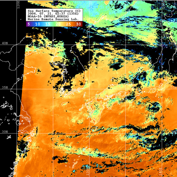 o 2004년 07월 21일 02시 37분 NOAA-16호 위성영상입니다. o 수온분포는 범례를 참고하시기 바랍니다. o 검은색은 구름과 육지를 나타냅니다.