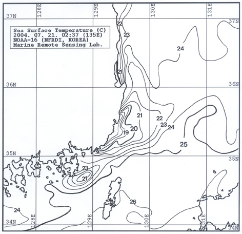 o 2004년 7월 21일 오전 10시 현재 동해남부연안 정지관측점에서 관측한 수온은 울산 섭씨 16도, 일광 17도, 기장 16.5도로 주변의 정상수온 22∼24도에 비해 5도 이상 차게 나타나고 있습니다.