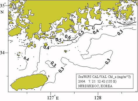 ㅇ 고흥반도 및 거제연안에는 외해역에 비해 약 2배의 고농도 분포, 즉 0.50∼0.70 mg/m3 클로로필 a 농도 분포가 나타나고 있습니다.
