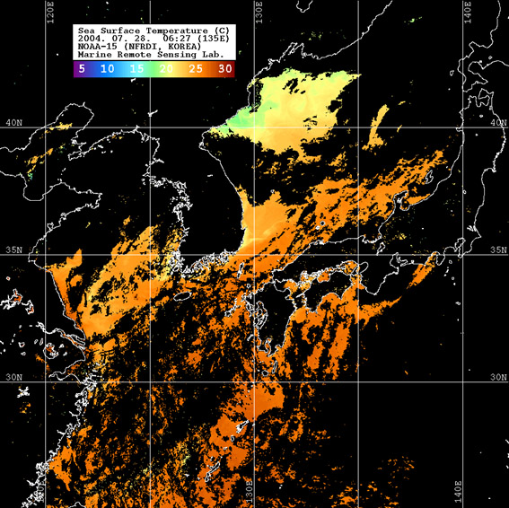 o 2004년 07월 28일 06시 27분 NOAA-15호 위성영상입니다. o 수온분포는 범례를 참고하시기 바랍니다. o 검은색은 구름과 육지를 나타냅니다.