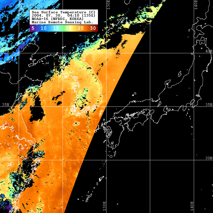 o 2004년 07월 30일 04시 10분 NOAA-16호 위성영상입니다. o 수온분포는 범례를 참고하시기 바랍니다. o 검은색은 구름과 육지를 나타냅니다.