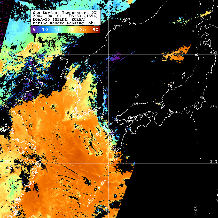 o 2004년 08월 01일 03시 53분 NOAA-16호 위성영상입니다. o 수온분포는 범례를 참고하시기 바랍니다. o 검은색은 구름과 육지를 나타냅니다.