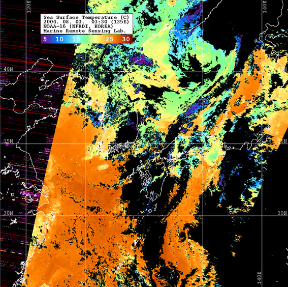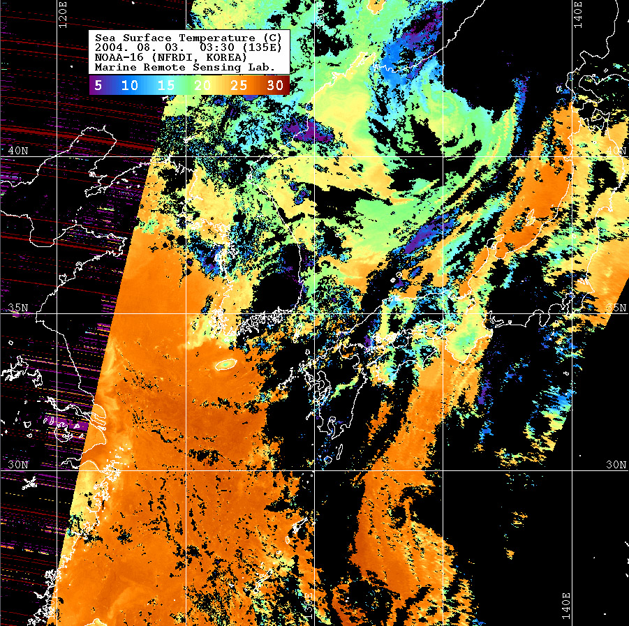 o 2004년 08월 03일 03시 30분 NOAA-16호 위성영상입니다. o 수온분포는 범례를 참고하시기 바랍니다. o 검은색은 구름과 육지를 나타냅니다.