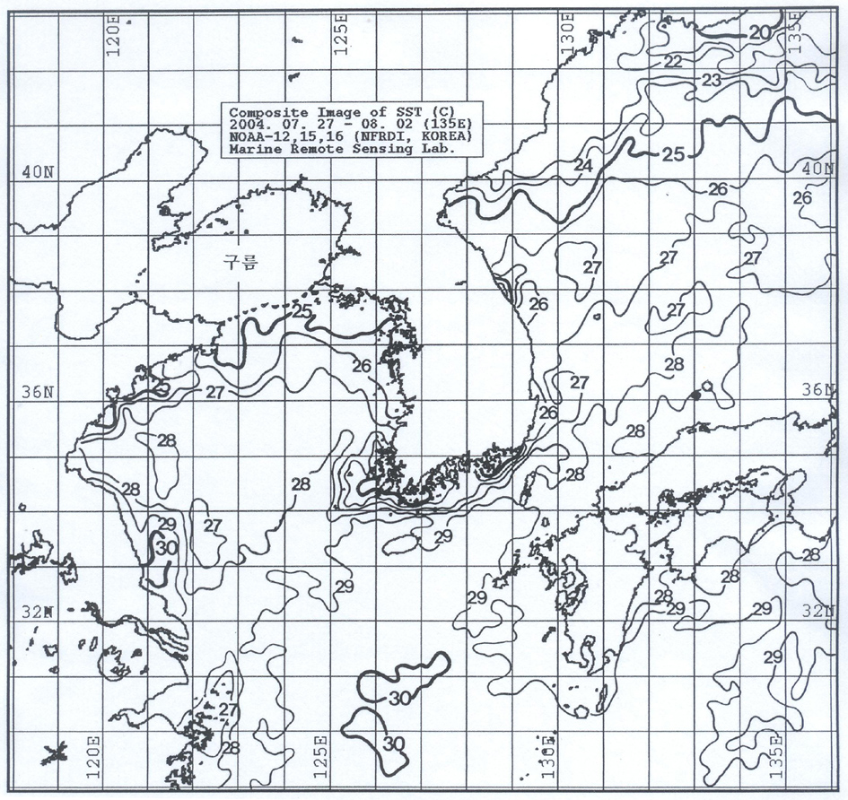 o 금주 (2004.07.27~08.02)의 한국근해 표면수온은 대화퇴 근해 26~27도, 울릉도 근해 27~28도, 대마도 근해 28~29도, 제주도 근해 29~30도, 이어도 근해 29~30도, 일향초 근해 27~29도, 어청도 근해 26~27도 내외로 나타납니다. o 「평년에 비해」수온은 대화퇴 근해 2.5도 높게, 울릉도 근해 3.5도 높게, 대마도 근해 2.5도 높게, 제주도 근해 3.5도 높게, 이어도 근해, 일향초 근해 및 어청도 근해 2도 높게 나타납니다. o 수온 전선대는 제주해협-대한해협 서수도간 해역에서 수온 28도를 중심으로 형성될 것으로 나타납니다. < 위의 그림을 클릭하시면 확대된 수온정보를 보실 수 있습니다 >