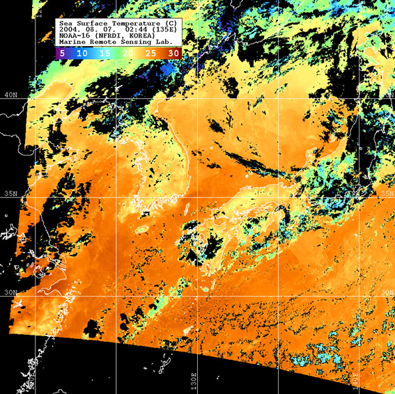 o 2004년 08월 07일 02시 44분 NOAA-16호 위성영상입니다. o 수온분포는 범례를 참고하시기 바랍니다. o 검은색은 구름과 육지를 나타냅니다.