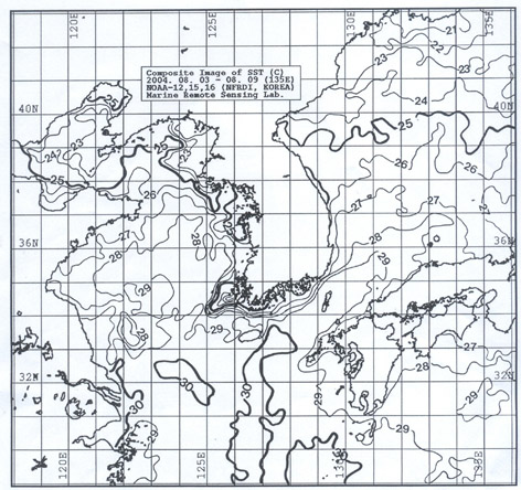 o 금주 (2004.08.03∼08.09)의 한국근해 표면수온은 대화퇴 근해 24∼25도, 울릉도 근해 26∼28도, 대마도 근해 29∼30도, 제주도 근해 29∼30도, 이어도 근해 29∼30도, 일향초 근해 27∼29도, 어청도 근해 26∼28도 내외로 나타납니다. o 「평년에 비해」수온은 대화퇴 비슷하게, 울릉도 근해 1.5도 높게, 대마도 근해 2도 높게, 제주도 근해 2.5도 높게, 이어도 근해, 일향초 근해 1도 높게, 어청도 근해 1.5도 높게 나타납니다. o 수온 전선대는 제주해협-대한해협 서수도간 해역에서 수온 27도를 중심으로 형성될 것으로 나타납니다. < 위의 그림을 클릭하시면 확대된 수온정보를 보실 수 있습니다 >