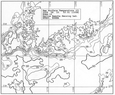o 아래그림은 2004년 8월 10일 03시 51분 현재 NOAA위성 16호가 관측한 남해 연근해 수온분포영상입니다. o 대한해협을 거쳐 동해로 북상하는 대마난류의 중심수온이 여전히 섭씨 30도의 고수온으로 나타납니다. o 진도군과 완도군 연안을 중심으로 22∼25도의 찬물분포가 강한 조류 (물흐름)의 영향을 받아 일시적으로 넓게 분포하는 것으로 나타납니다.