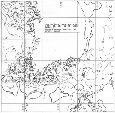 o 아래그림은 2004년 8월 11일 03시 31분 현재 NOAA위성 16호가 관측한 한반도 연근해역 수온분포영상입니다. o 제주도 서부해역에서 30도이상의 고수온현상이 나타나고 있습니다. o 강한 조류(물흐름)의 영향을 받아 저층의 냉수와 표층의 더운물이 혼합됨으로써 태안반도 연안, 진도군 연안 및 완도군 연안을 중심으로 22∼25도의 찬물이 넓게 분포하는 것으로 나타납니다.