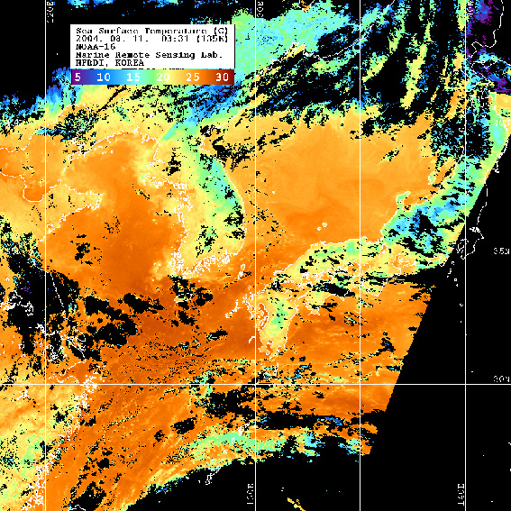 o 2004년 08월 11일 03시 31분 NOAA-16호 위성영상입니다. o 수온분포는 범례를 참고하시기 바랍니다. o 검은색은 구름과 육지를 나타냅니다.