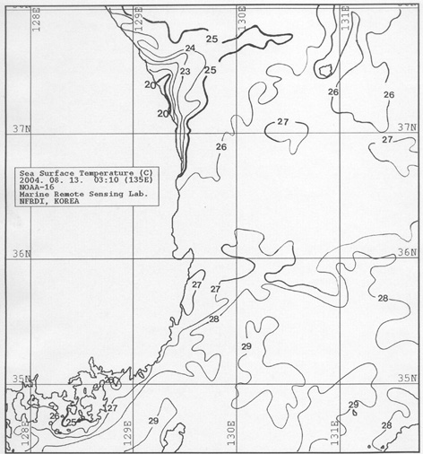o 아래그림은 2004년 8월 13일 03시 10분 현재 NOAA위성 16호가 관측한 동해 및 동해남부 연근해역 수온분포영상입니다.