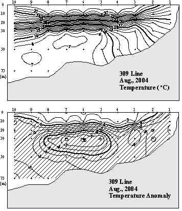 o 2004년 8월 7일 국립수산과학원 서해수산연구소에서 조사한 309선(군산 서방)의 수직수온분포도 및 평년편차도 입니다.