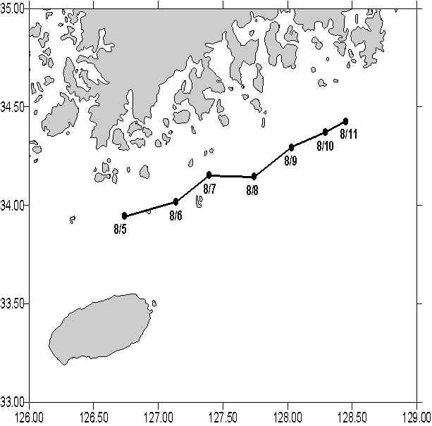 o 2004년 8월 5~11일에 부산대학교 이동규 교수팀에서 조사한 위성추적 표류부이 관측결과 입니다.