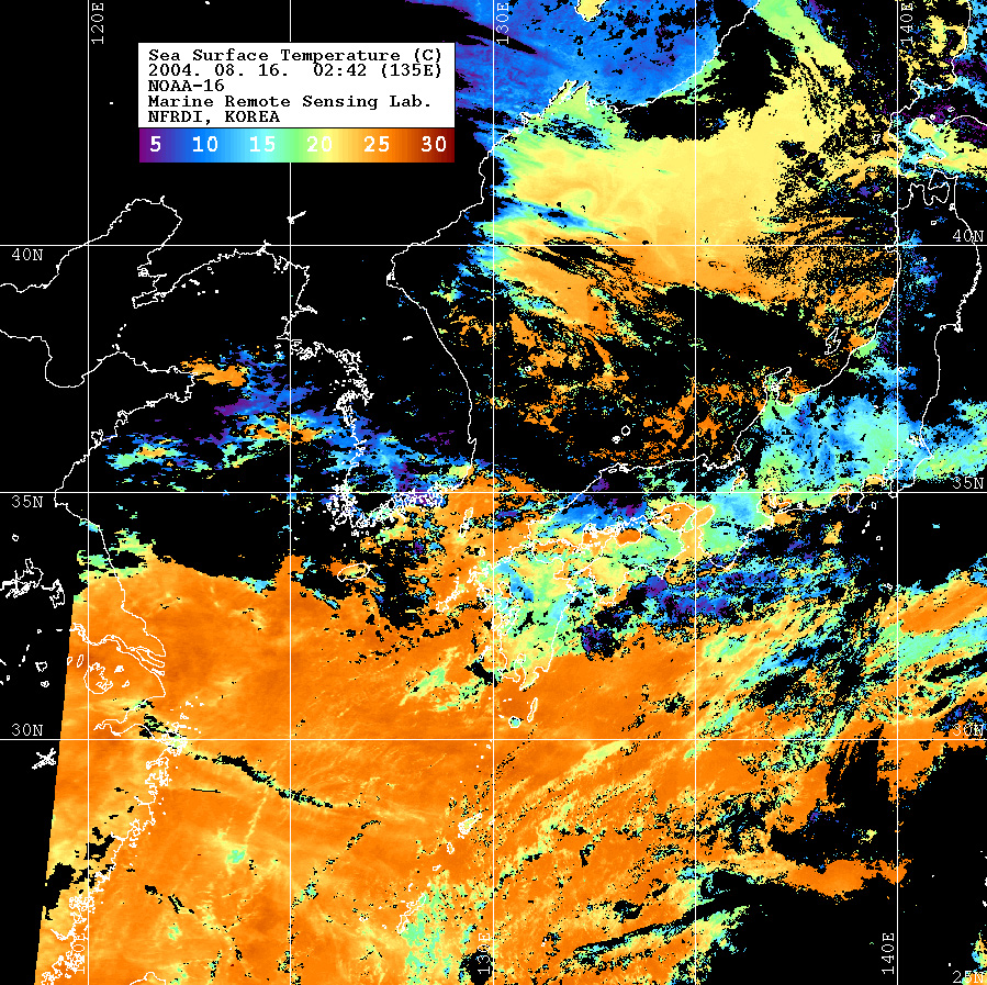 o 2004년 08월 16일 02시 42분 NOAA-16호 위성영상입니다. o 수온분포는 범례를 참고하시기 바랍니다. o 검은색은 구름과 육지를 나타냅니다.