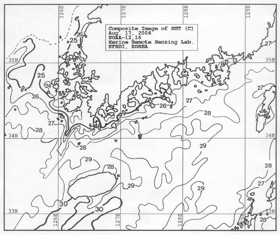 o 아래그림은 2004년 8월 17일 03-06시경 NOAA위성 12호와16호가 관측한 남해 연근해역 수온분포영상입니다. o 진도군과 완도군 연근해역에 나타났던 찬물세력이 약화되었습니다. 이는 저조시인 오늘, 연안에서 약화된 물흐름(조류)과 주변해역의 뚜렷한 고수온 현상의 영향을 받은 것 때문으로 보입니다. o 이상 고수온 현상이 발생하고 있는 남해연안의 양식장 및 패쇠만 등에서는 각별한 주의가 요망됩니다.