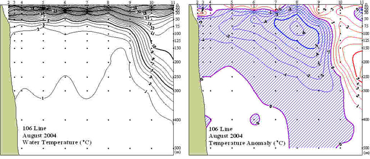 ◦ 2004년 8월 10일 국립수산과학원 동해수산연구소에서 조사한 106선(주문진 동방)의 수직수온분포도 및 평년편차도이다.