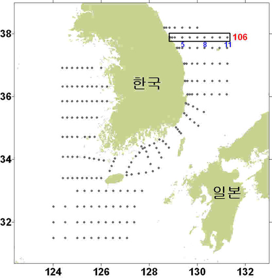 ◦ 평년에 비해 표층~30m까지는 높았으나, 연안은 낮게 나타났다. 그 이심으로는 외해역을 제외하고 전체적으로 최대 6℃ 정도 낮았으며, 외해역은 수심 250m 부근을 중심으로 최대 6℃ 정도 높게 나타났다.