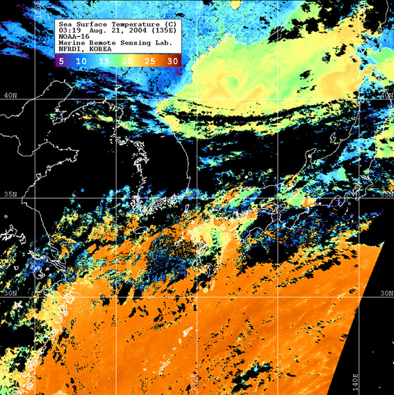 o 2004년 08월 21일 03시 19분 NOAA-16호 위성영상입니다. o 수온분포는 범례를 참고하시기 바랍니다. o 검은색은 구름과 육지를 나타냅니다.