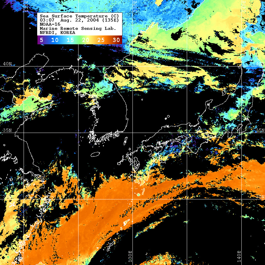 o 2004년 08월 22일 03시 07분 NOAA-16호 위성영상입니다. o 수온분포는 범례를 참고하시기 바랍니다. o 검은색은 구름과 육지를 나타냅니다.