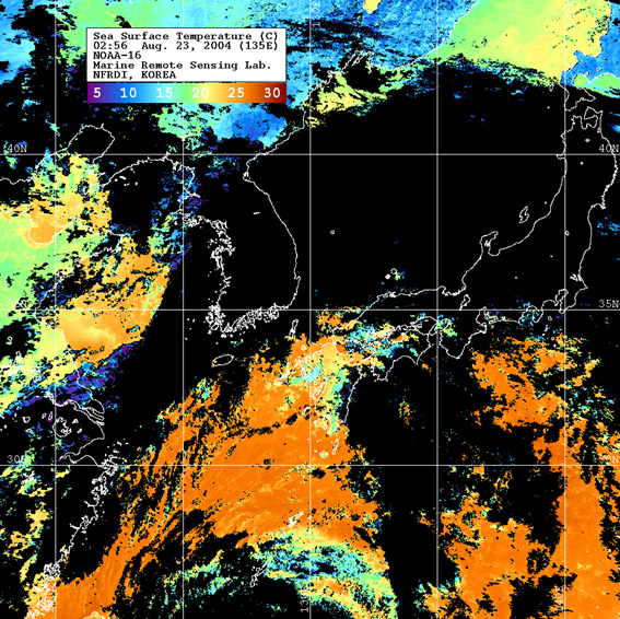 o 2004년 08월 23일 02시 56분 NOAA-16호 위성영상입니다. o 수온분포는 범례를 참고하시기 바랍니다. o 검은색은 구름과 육지를 나타냅니다.