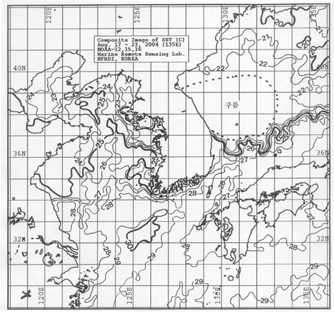 o 금주(2004.08.17∼08.23)의 한국근해 표면수온은 대화퇴 근해 24∼26도, 울릉도 근해 26∼27도, 대마도 근해 28∼29도, 제주도 근해 28∼30도, 이어도 근해 29∼30도, 일향초 근해 28∼29도, 어청도 근해 25∼26도 내외로 나타납니다.