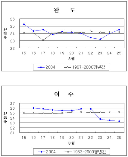 o 아래그림은 매일 오전 10시에 완도와 여수연안의 정지관측점 에서 관측한 수온의 일일변동 변화입니다.