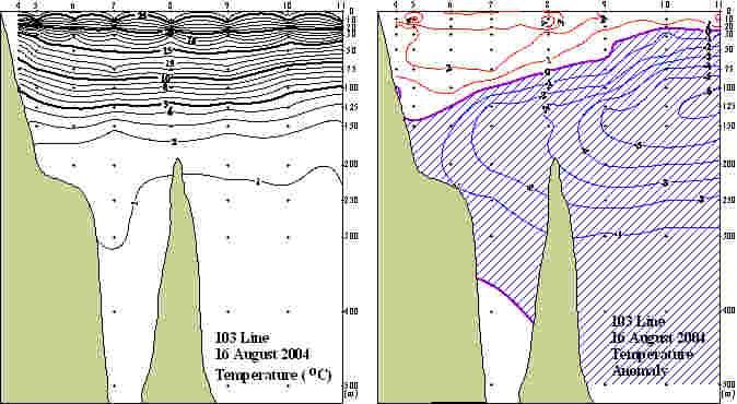 ◦ 2004년 8월 16일 국립수산과학원 동해수산연구소에서 조사한 103선(영덕 동방)의 수온수직분포도 및 평년편차도입니다.