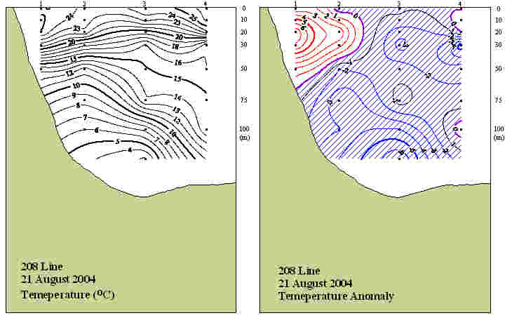 ◦ 2004년 8월 21일 국립수산과학원 동해수산연구소에서 조사한 208선(울산 동남방)의 수온수직분포도 및 평년편차도입니다.