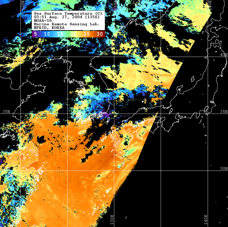 o 2004년 08월 27일 03시 51분 NOAA-16호 위성영상입니다. o 수온분포는 범례를 참고하시기 바랍니다. o 검은색은 구름과 육지를 나타냅니다.