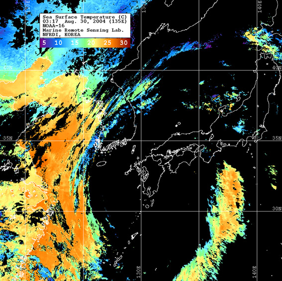 o 2004년 08월 30일 03시 17분 NOAA-16호 위성영상입니다. o 수온분포는 범례를 참고하시기 바랍니다. o 검은색은 태풍 제 16호 차바와구름 또는 육지를 나타냅니다.
