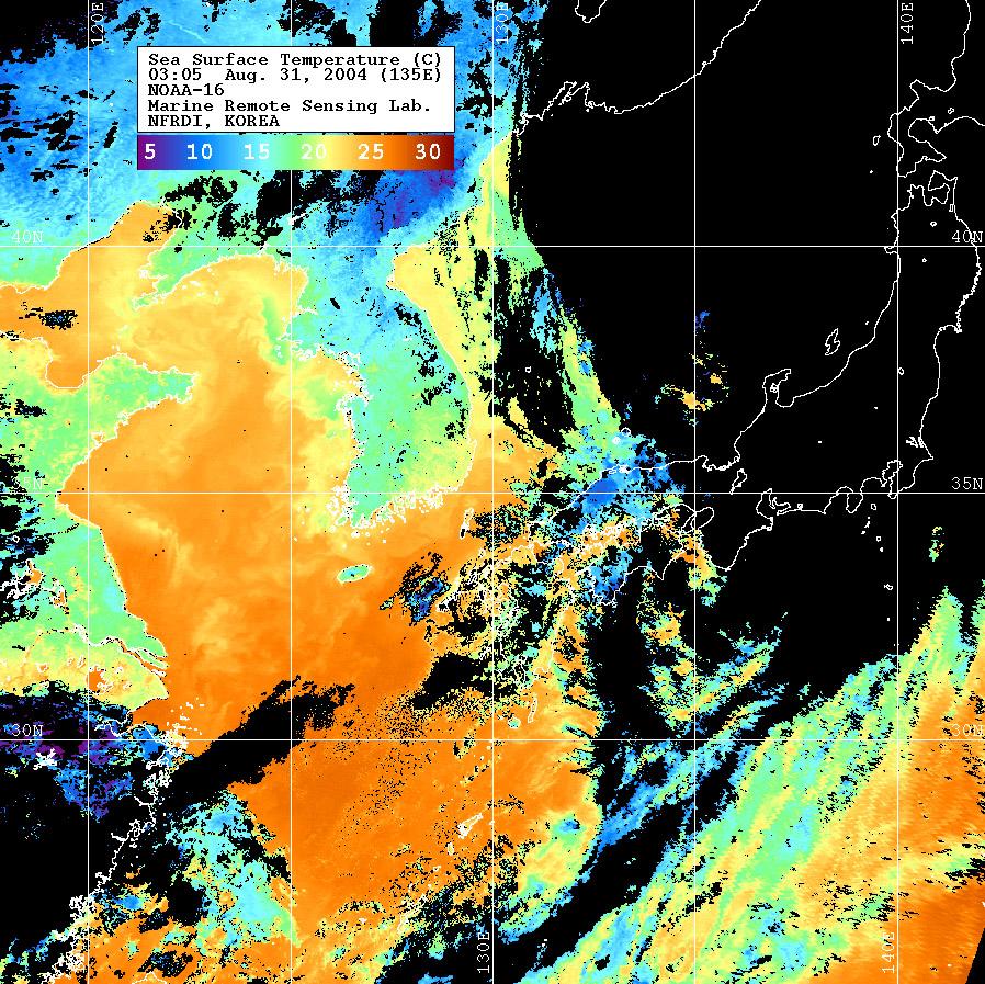 o 2004년 08월 31일 03시 05분 NOAA-16호 위성영상입니다. o 수온분포는 범례를 참고하시기 바랍니다. o 검은색은 태풍 제 16호 차바와구름 또는 육지를 나타냅니다.