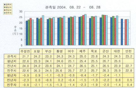 o 금주(2004.08.22∼08.28)의 한반도 연안 표면수온은 동해 연안역에서 섭씨 21.5∼24도, 남해 연안역에서 23∼25도, 서해 연안역에서 23∼24.5도 내외로 나타납니다.