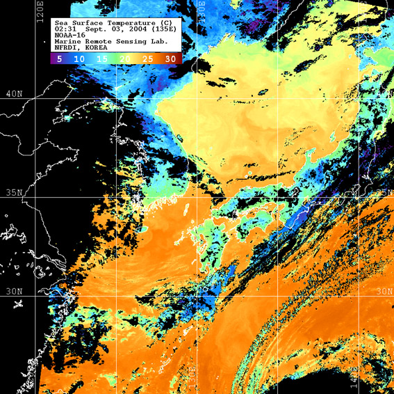o 2004년 09월 03일 03시 31분 NOAA-16호 위성영상입니다. o 수온분포는 범례를 참고하시기 바랍니다. o 검은색은 구름 또는 육지를 나타냅니다.