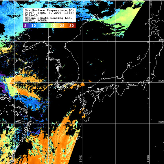 o 2004년 09월 04일 04시 07분 NOAA-16호 위성영상입니다. o 수온분포는 범례를 참고하시기 바랍니다. o 검은색은 구름 또는 육지를 나타냅니다.