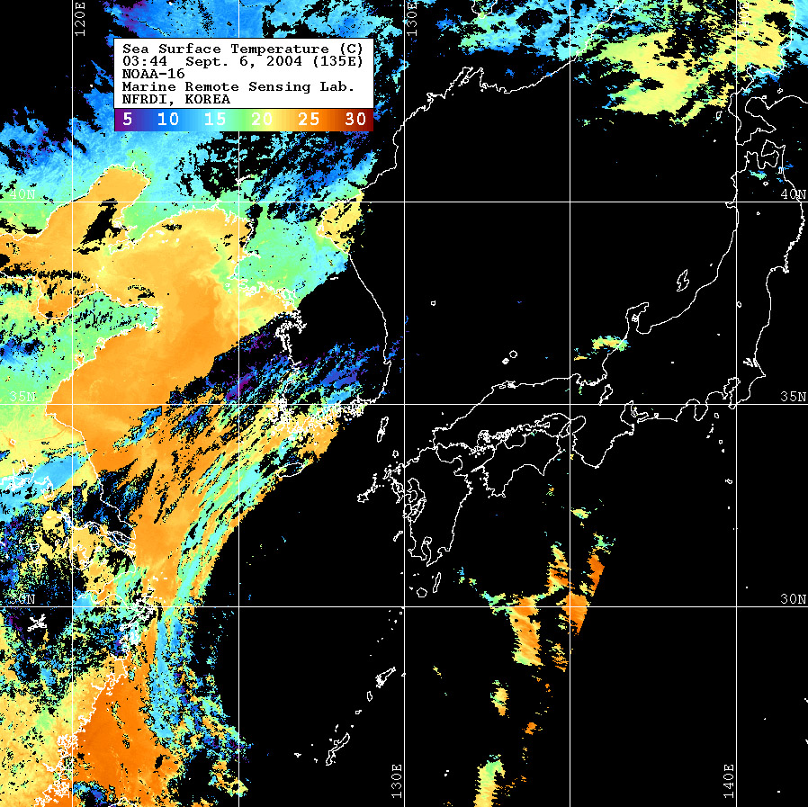 o 2004년 09월 06일 03시 44분 NOAA-16호 위성영상입니다. o 수온분포는 범례를 참고하시기 바랍니다. o 검은색은 구름 또는 육지를 나타냅니다.