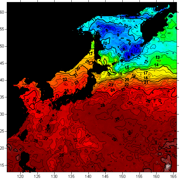 o 2004년 9월 6일 북서태평양 광역해양 수온분포 입니다.