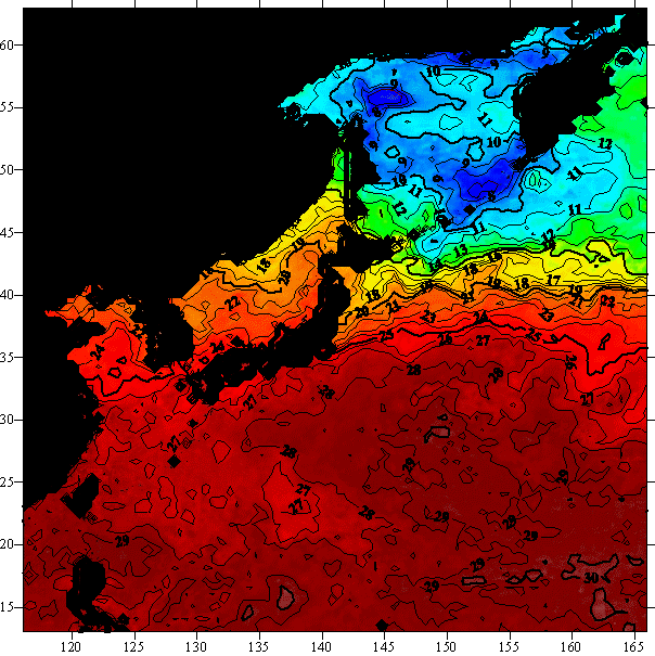 o 2004년 9월 9일 북서태평양 광역해양 수온분포 입니다.