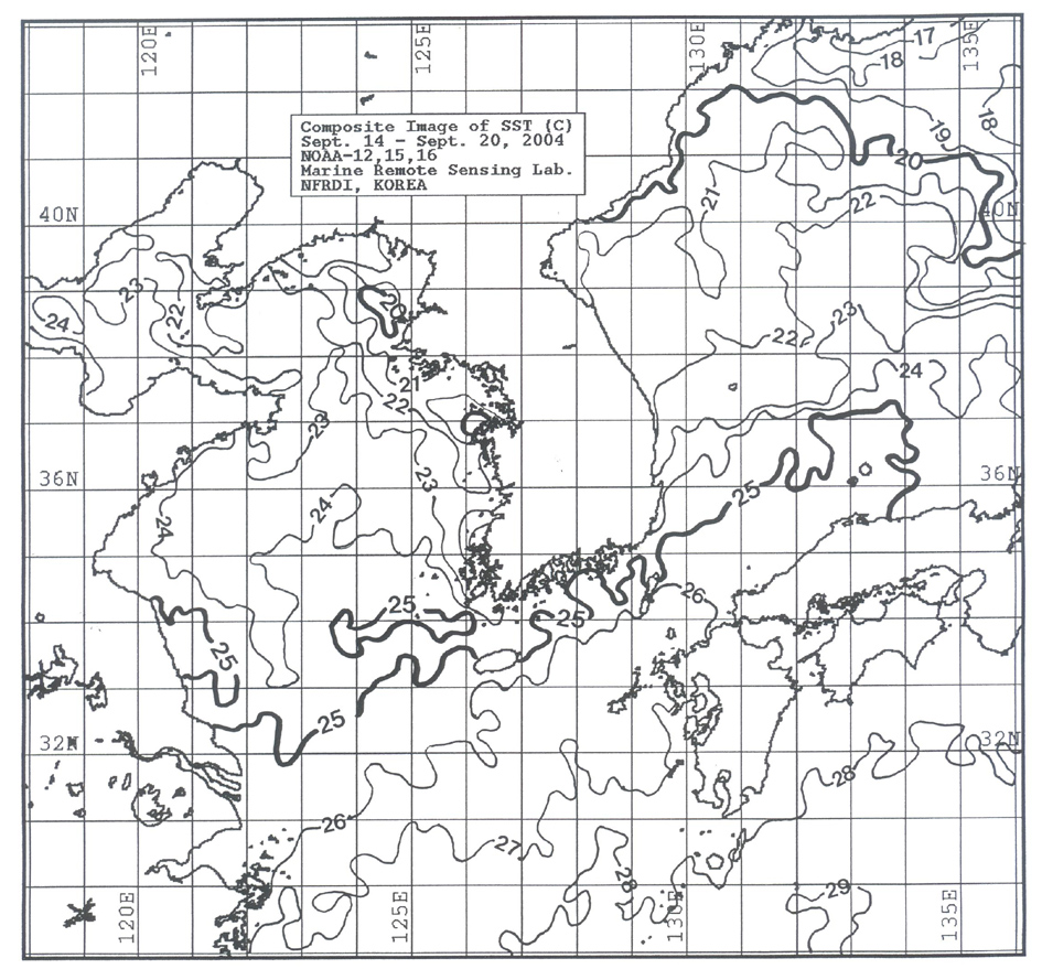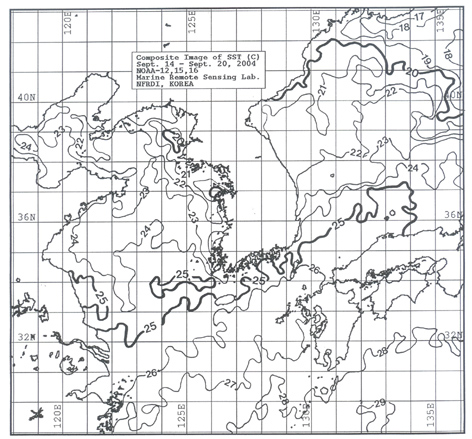 o 금주 (2004.09.14∼09.20)의 한국근해 표면수온은 대화퇴 근해 섭씨 20∼22도, 울릉도 근해 22∼23도, 대마도 근해 25∼26도, 제주도 근해 24∼26도, 이어도 근해 25∼26도, 일향초 근해 24∼25도, 어청도 근해 22∼23도 내외로 나타납니다.