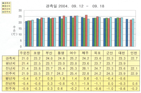 o 금주(2004.09.26∼10.02)의 한반도 연안 표면수온은 동해 연안역에서 섭씨 21∼23도, 남해 연안역에서 24∼25도, 서해 연안역에서 23∼24도 내외로 예상됩니다.