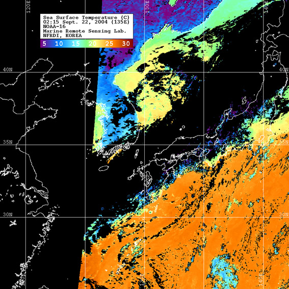 o 2004년 09월 22일 02시 15분 NOAA-16호 위성영상입니다. o 수온분포는 범례를 참고하시기 바랍니다. o 검은색은 구름 또는 육지를 나타냅니다.