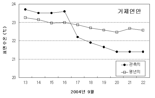 o 거제도 남동부 연안역 표면수온의 일별 변동(2004. 9. 13 ∼ 9. 22) 입니다.