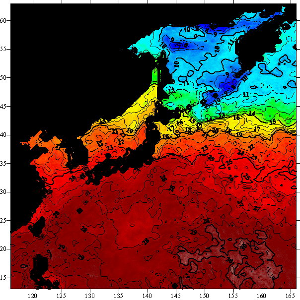 o 2004년 9월 21일 북서태평양 광역해양 수온분포 입니다.