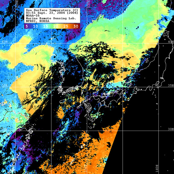 o 2004년 09월 23일 03시 51분 NOAA-16호 위성영상입니다. o 수온분포는 범례를 참고하시기 바랍니다. o 검은색은 구름 또는 육지를 나타냅니다.