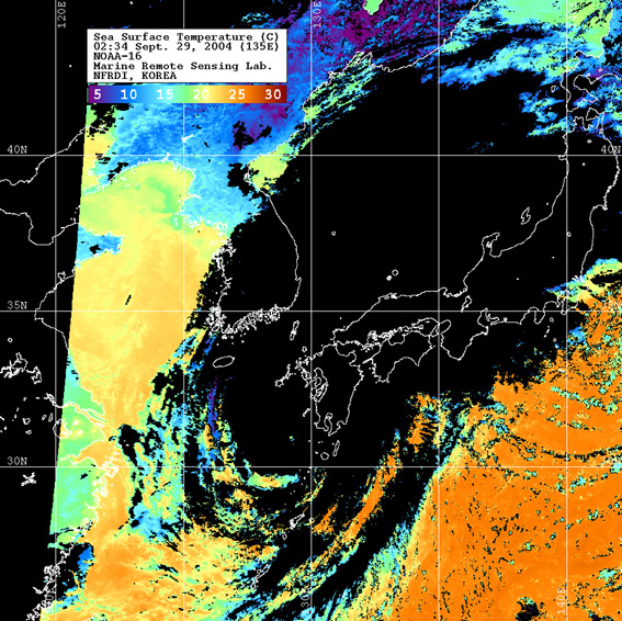 o 2004년 09월 29일 02시 34분 NOAA-16호 위성영상입니다. o 수온분포는 범례를 참고하시기 바랍니다. o 검은색은 구름 또는 육지를 나타냅니다.