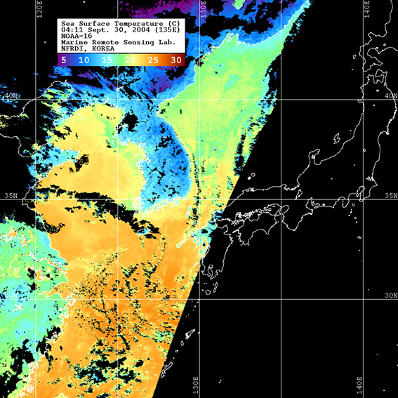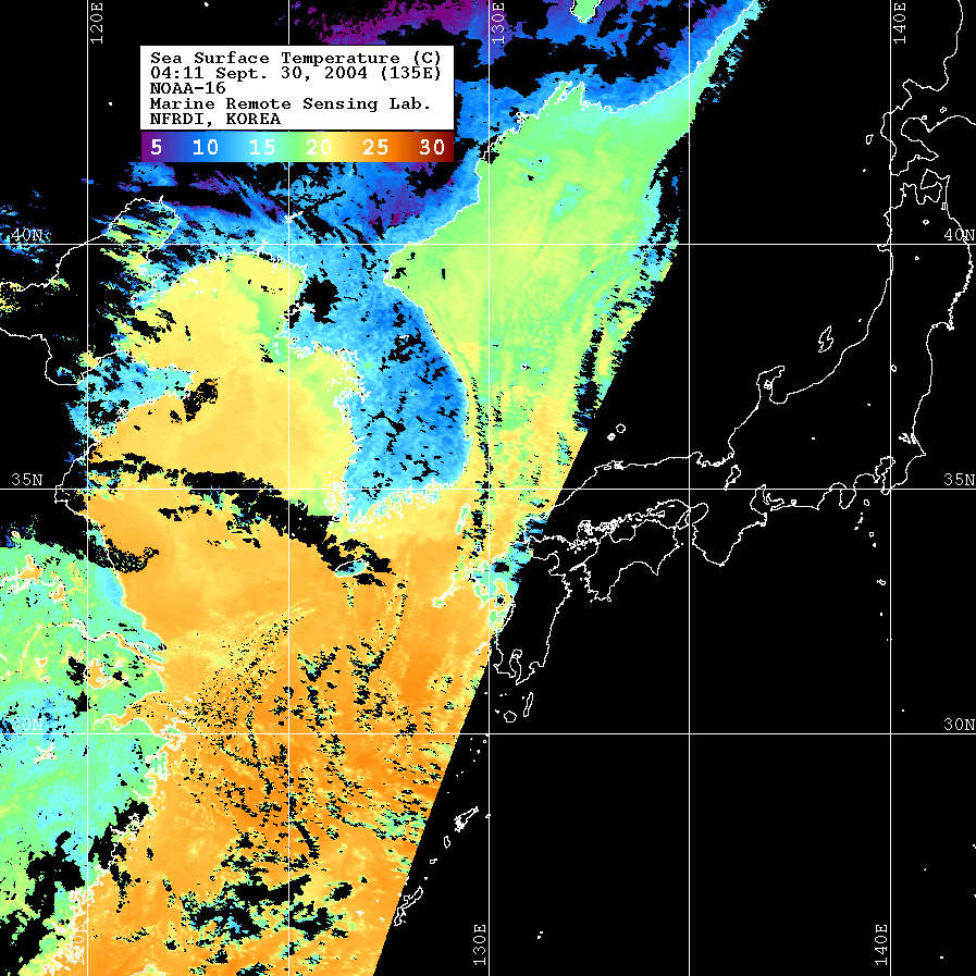 o 2004년 09월 30일 04시 11분 NOAA-16호 위성영상입니다. o 수온분포는 범례를 참고하시기 바랍니다. o 검은색은 구름 또는 육지를 나타냅니다.