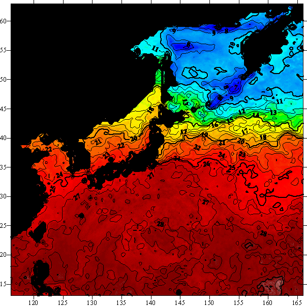 o 2004년 9월 24일 북서태평양 광역해양 수온분포 입니다.
