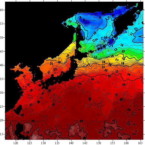 o 2004년 9월 29일 북서태평양 광역해양 수온분포 입니다.