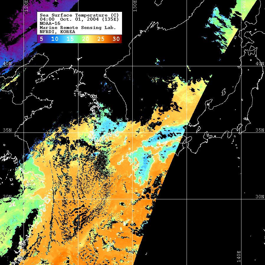 o 2004년 10월 01일 04시 00분 NOAA-16호 위성영상입니다. o 수온분포는 범례를 참고하시기 바랍니다. o 검은색은 구름 또는 육지를 나타냅니다.