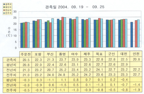 o 금주(2004.09.19∼09.25)의 한반도 연안 표면수온은 동해 연안역에서 섭씨 20.5∼22.5도, 남해 연안역에서 21.5∼24도, 서해 연안역에서 21∼23도 내외로 나타납니다.
